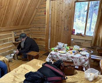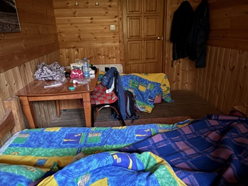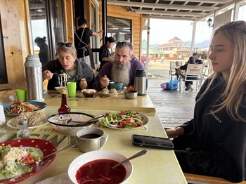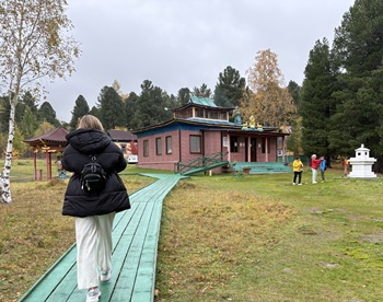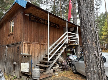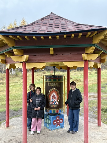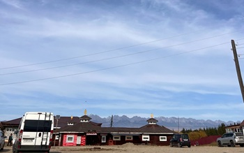 この日は雨模様だった。朝食は、外のバーベキューの場所では寒いから、私たちの2階のリビングでとろうと、昨夜ガイダイさんは言っていた。だが朝になって、アーニャが、自分たちのバンガローで食べることにすると言いに来てくれた。約束の9時頃、行ってみるとガイダイさんが携帯コンロで料理を作ってくれていた。バンガローの宿泊客は屋外の寒いトイレ(もちろん、ボットン・トイレ)へ夜中でも行かなくてはならないし、シャワーは、ペンションの蒸し風呂だ。だから三角屋根のバンガローのドアを開けると、そこはリビング兼ベッドルームだけだった。 ガイダイさんたちが準備している間、私たちは決まり悪げにただ座って、アーニャと仲良し写真を撮っただけだ。アーニャは本当にかわいい子だ。 ガイダイさんたちが住むマリタ村のいくつかの店舗はリュドミラ・イヴァニィさんと彼女のママの所有らしい。イヴァン・ガイダイさんは初婚ではないらしい。アーニャとイヴァンはあまり似ていないように私は思ったが。もちろん聞けない。イヴァンは長いあごひげで、彼が日本へ来たときは、みんなから見つめられ、時にはアイヌ人かと思われたとか。 朝食が終わると、みんなで片付けた。アーニャもかいがいしく段ボールを車まで運んでいる。 アルシャンには何軒かダッツァン(チベット仏教寺院)がある。マーシャ・マレヴァーノヴァ малевановаが行ってみたいと言ったので、ペンション群からやや離れたホイモルスキィ・ダツァン(*) Хойморский дацан (Бодхидхарма菩提達磨)の前に車を止めた。 *ダッツァン トゥヴァの新築仏教寺院(ウスチ・フレー)に行ったこともあるし、最近ではサンクト・ペテルブルクのダッツァン(仏教では最も西方にあるという)の入り口も見た。ブリヤート共和国はモンゴルのようにチベット仏教の国で仏教寺院や僧院(僧坊、庫裏)が多い。ウィキペディアにも15個の項目がある。最も有名なのはイヴォルギン寺院Иволгинский дацан «ハンブィン・フレーХамбын Хурэ»だろうが、ホイモル寺院も、ウィキペディには載っている。それは別称アルシャン寺院という。 寺院の前にあった謂れ(いわれ・由緒)によると、この寺院は20世紀のロシア仏教の歴史における重要な人物の一人の声かけで1917年に設立された。が、1936年には閉鎖。1990年代に再興され、トゥンキンスキー地区の仏教の一派の中心だそうだ。 チベット仏教寺院にはマヤ車がある。回してみる。ストゥーパもある。『ストゥーパとは元々の意味はサンスクリット語で『積み重ねる』『高く顕われる』という意味で、初期には釈迦牟尼の遺骨(仏舎利)を納めるために作られた塚のことだった。仏教の広まりとともに、その教えや悟りを象徴する祈念碑(記念碑)としての性格を強め、形も半球型のドーム型や釣り鐘型のストゥーパが建てられた。日本ではストゥーパと言う言葉は中国を経て日本に伝わる課程で音訳され、卒塔婆(そとば)と呼ばれている。(ストゥーパは日本では形も意味も少し違うが五重塔や卒塔婆の原型になった)』以上ウィキペディから。 ブリヤート共和国のチベット仏教のストゥーパを、現地のしきたり通り、決まった方向に3回まわってお参りする。このストスーパの前には次のような説明文があった。 『ストゥーパ(仏塔) は仏教の伝統的な建造物であり、宇宙の働くモデルを表すものです。それはブッダの悟りのエネルギー、彼の智慧、慈悲の力を内に宿しています。ストゥーパのそばで発せられたすべての言葉や願いは、その力によって増幅されます。ストゥーパは太陽の進む方向(時計回り)に回って参拝します。 お願い ストゥーパ(スバルガン)の上にキャンディー、クッキー、ひまわりの種、ナッツ、タバコ、米、あらゆる種類の穀物を置かないでください。それらは雨に濡れるとアリを集め、ストゥーパを汚し、外観を損ないます。寄付をされる場合は、鉄製の献金箱をご利用ください。』 寺院の中ものぞいてみる。中央に僧侶がいて、低いテーブルを挟んでブリヤート人に話している。これは、表の説明板に書かれていたように、僧侶に自分や近しい人の健康や福を祈ってもらっているのだろう。そのためには用紙に名前を書いて会計窓口に出さねばならない。説明書にはそのほかに、 『故人への特別な祈り。ラマから星座に基づく今年の運勢と個人的な問題への助言。ダッツァン(チベット寺院)付属の予防・リハビリセンターでチベットからのラマによる助言や治療が受けられる。祭具や護符を手に入れる。』とあって、入り口の横には会計窓口もある。順番を待っている人が窓際の椅子に腰掛けている。見ていると、信者は紙に多分自分の名前を書いて、窓口で1000ルーブル札を手渡している。マーシャ・マレヴァーノヴァに聞いてみると、金額は決まっていない。 ラマと話してみたいと思い、ラマのロシア語がわかりにくいかも知れないから、彼女に一緒に来てもらうことにして500