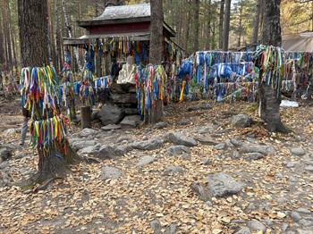 クィンガルガ川のほとりへ行く道は屋台がひしめくマーケットになっていて、ここは歩くしかない。ジェムチュガ村の屋台同様モンゴルのラクダ毛のベストや、帽子、マフラー、手袋などが売っている。中国製らしいおもちゃもあって、アーニャがおねだりしている。ミント茶のたまらないほど良い香りの葉っぱが売っている屋台では、香りにつられてсаган далиという見慣れないはっぱを1カップ買った。リューダさんはイヴァン・チャイとかチェブレーツчебрецを勧めてくれたが、それはいつもニキータが日本へ来るときにお土産に持ってきてくれる。 歩いていくと有料トイレ小屋が見える。一人1回30ルーブルだ。ナプキンも売っていて1個40ルーブルと書いてある。窓口にはかわいい顔の少年が座っていた。モンゴル人でもブリヤート人でも日本人と同じ顔だ。特に子供は日本の小学生と変わらない。 アルシャンの地の神を祭った小屋がある。周りのロープにも木にも南シベリアの習慣(地元の宗教的)通り、ぎっしりと色とりどりのリボン(布きれ)が結んである。 『健康の小道』と書かれ門があって、そこから入るとアルシャンの目的地鉱泉場へ行ける。小道はロシア人も歩いている。クィンガルガ川のほとりに到着する。木々の間を縫って流れてくるが今見たところ、何でもない石ころだらけの山川だ。川に沿って手すりのついた古びた階段がみえる。危なっかしそうな階段を何人かの人が昇っている。クィンがルカ川の上流や中流へ行くためのこれでも安全な足場だ。上中流には有名な滝があるが。階段は途中までしかない。その階段の途中にはアルシャン(鉱泉の意)の湧き出るところが数カ所あるらしい。私は同行者には悪いが、滝も鉱泉もパスした。だからリューダさんたちとこの石原のベンチに腰掛けて、先ほどの道で買ったアイスを食べたり、ただ休んでいたり、自撮り他撮りをしていただけだ。対岸には青い塀が見える。帰国後地図で知ったことだが、結核療養所らしい。この敷地内にも鉱泉が出る。 アルシャンの空気を吸って、私たちは引き上げた。鉱泉にも浴びず、滝も見ないというのは邪道で、後にブリヤート人やイルクーツク人に「アルシャンへ行った」というとみんなに鉱泉を浴びてきたものと思われる。実は、私はトゥヴァ(同じ南シベリア)でこの冷たい鉱泉浴びは何度か経験している。 『健康の小径』を出るとイヴァンに再会できた。一緒に屋台通りの裏にある『瞑想の仏陀』にもお参りする。蓮の上に座る仏陀は青色で、赤い法衣を身につけている。ヘアスタイルはガンダーラ様式(ギリシャ仏教美術)ではなくグプタ様式(インドのグプタ朝は320-550年)だった。飛鳥時代初期の仏像は、インド西北部・ガンダーラでヘレニズムの影響を受けて、中央アジアから中国西域を得て朝鮮半島・日本と伝わったので、ガンダーラ様式だ。白鳳・天平(7-8世紀)の仏像はグプタ朝から中国唐を経て伝わったのでガンダーラ様式は見られない。一方、ブリヤートなどモンゴルは、ガンダーラ、グプタ時代はまだ遊牧国家(匈奴、突厥など)だったので仏教は未発達(未浸透)。7-9世紀チベットが仏教を導入、このとき、グプタ様式のインド仏像様式がチベット仏教に移入、11-13世紀頃に密教美術と融合し、チベット仏教美術が形成、このチベット仏教が13世紀モンゴル帝国のフビライの時に国教となった。 だから、アルシャンの仏像はこんな風に派手なチベット仏教様式なのだ。 |