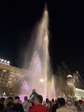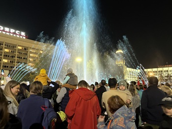 クラスノヤルスク・オペラ・バレエ劇場は、昔の滞在中何度も行った。その頃はチケットも安く、出演者もモスクワやサンクト・ペテルブルクと比べると(多分)それほどでもないだろうと思っていたものだ。オペレッタ劇場の方が行きやすいし、興味深いプログラムが多いと思っていたものだ。『コルサール』は実は2024年サンクト・ペテルブルクのキーロフ劇場(世界1流のはず)で見ている。 リューダさんたちと駐車場を見つけるのに苦労はしたが、なんとか6時半頃劇場の入口に着いていた。プログラムによると、ヒロインにはこの劇場のプリマ、アンナ・クドリャクツェヴァАнна Кудрявцеваが演じている。ロシア功労芸術家だ。日本なら『紫綬褒章』が授与されたバレリストか。功労芸術家より上位には『人民芸術家』がある、こちらは日本で言えば人間国宝に近いニュアンスだそうだ。出演者にはそのほかクラスノヤルスク地方功労芸術家さんも2人プログラムに載っている。 やはりバレエの国ロシアだ、地方都市クラスノヤルスクと言っても素晴らしい。素人の私には、キーロフ劇場とクラスノヤルスク劇場の『コルサール』の舞台の装置や踊りの振り付けが違うことはわかるが、バレエの水準の差がさっぱりわからない。どちらがよかったかわからない。クラスノヤルスクの方が劣るとはとても思えない。『コルサール』は少年のマトベイも感動したようだ。初めてバレエを見た孫娘も、だ。何度も見ている(しかし、久しぶりの)私とリューダさんも、だ。 9時半には終わって劇場前広場に出た。ここは昔からクラスノヤルスクの中心だ。噴水はここ数年の地方庁政府の援助で立派に修復され、広場には老舗のクラスノヤルスク・ホテルやカフェが面していて、通りを隔ててクラスノヤルスク市の役所群が建っている。9時半頃劇場を出て広場に降りると、一面のネオンの夜景だった。噴水を色とりどりの光で照明している。音楽が鳴っていて、その曲に合わせて噴水が踊り、色が変わる。広場には大勢の親子連れやカップルであふれている。楽しい音楽に合わせ、噴水と一緒に、または噴水の周りで踊っているグループもいる。誰もが心もウキウキとして、噴水の色変わりと踊りに見惚れていた。噴水は何本もあってお互いに曲に合わせてくっついたり離れたり飛び上がったりしている。色と踊りと曲がぴったり合っていた。広場は満員のクラスノヤルスク人たちだ。流れる曲の中には『ロシア!ロシア!』と愛国的なのもあった。このときだけ愛国主義を許す。楽しそうな人々を見ていると、これが戦争をしている国かと疑いたくなる。全面戦争ではなく『特別軍事作戦』だから、人々の生活は平穏で豊かでなくてはならない。 10時には音楽は止み、照明も色のない動かない静かなものになり、噴水ももう踊らなくなった。私たち4人はまだ帰宅しない。ニコラエフスクの丘から市内の照明をリューダさんが私に見てほしいと思ったのだろう。夜景は素晴らしい。電気代の安い国だからね。モスクワの夜景は近くで見たが、クラスノヤルスクでこうして郊外の高台から見るのもいい。昼間の眺めとも違う。ウラルの東で一番高い旗竿とはためく国旗も夜景に浮き出て、ロシアの威力を示している。マトベイ少年は車の中で眠っていた。 |