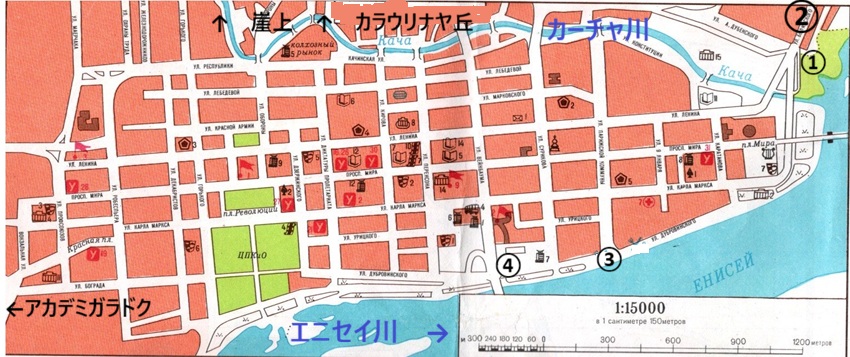クラスノヤルスク市旧市街 1ドゥベンスキィ像、2医科大学、3エニセイ河川駅 4,オペラ・バレエ劇場![]() |
