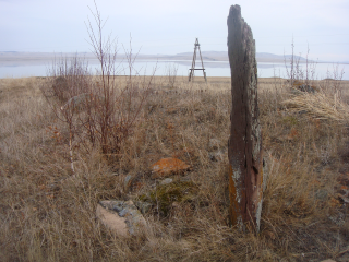 ヴァロージャは同じチェルノゴルスク市に住んでいるので、スラーヴァのように20キロとは言えアバカン市に迎えに行ったり、送って行ったりしなくてもいいところが、時間の節約になる(その時スラーヴァはあのニーヴァが故障中だったらしい)。出発は8時と言う早めに決めていたので、8時20分にはもう、チェルノゴルスクから北へ行く国道54号線をパドクーニャ山まで来ていた。 エニセイ川(この場所の標高は230メートル)にせり出す570メートルのクーニャ山はハカシアの聖地のひとつで、その裏に続くパドクーニャ山地(クーニャのパドの意味、パドとは『下』、『裏』の意、だからクーニャの麓の意)には岩画も多い(323点ある)。今、『表の』クーニャ山には国道54号線が通っているが、昔もパドクーニャ山地を超えて、(少し川筋から離れるが)エニセイ沿いに北へ続く道があったのだろう。道端におなじみの馬繋ぎ柱・コノヴァースがある。この木製の柱は新しく、周りにチャロマがたくさん結んであった。何度も国道54号線を通るが、ここにコノヴァースがあるとは知らなかった。ヴァロージャのおかげだ。ここで私たちは乗って来た馬は繋がなくとも、乗物から降りて布切れを結んだり、コインを置いたり、アイランを飲んだりしなくてはならない。ヴァロージャは持ってきたアイランの1リットル・ペットボトルを取り出したが、私は、せっかくのヴァロージャのお祖母さんが作ったアイランだが、乳製品は遠慮した。マリーナが飲んでくれた。 昨日と同じ道を160キロほどシラー町の方へ走る。枯れ葉色の草原と遠くの青い山の輪郭は昨日と同じだが、この日のガイドのヴァロージャの話は興味深かった。彼はハカシア人で、ハカシア人から見たハカシア史を語ったからだ。歴史の本(たとえば、シベリア史教科書などは特に)はたいがいロシア側から書いてあるが、ハカシア人のヴァロージャの説明は、私が考えていた歴史に少し近い。