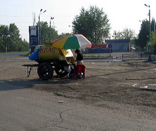 会社にはインターネットにつながっているパソコンは社長室の机に1台あるだけです。私がその会社にいる時はいつもその机の前に座っていました。日本からの連絡も多かったからです。パソコンをするためにクラスノヤルスクに来たみたいでした。その部屋に入ってくる社員や来客たちが、社長室の机に座ってパソコンを開けている私を、当たり前のことのように見てくれるのもロシアらしいです。 「ディーマはどこ?」と聞かれるので、 「今ちょっと出たところ、すぐ戻ってくるよ」などと、相手に合わせます。 やっと3時過ぎ、ディーマの会社の在庫管理のジェーニャ夫妻や常務のミーシャ夫妻などがそれぞれの車(皆スバルだ。彼ら、スバルの愛用者)で出発しました。途中、ヴァジムの車が車検切れで警察に停められたので、目的地のマン川畔についたのは5時過ぎでした。 4組の夫婦(みんな30歳前後)と一人ぼっちの私の9人が川岸でバーベキューをして、飲んで食べて帰るという、どちらかと言うと(期待がいっぱいな旅行者には)つまらないプログラムでした。クラスノヤルスクからの近場のマナ川の畔なんて私はいろいろな人と何度も来ていますから。でも、つまらなそうにしていると、皆に気を使わせることになるし、4組の夫婦と共通の話題もないし、雨は降ってくるし、ごみも落ちている川岸は絶景とはいえないし、でも、楽しそうに写真を撮りまくっていました。 マナ川は川くだりのグループが多く、筏やゴムボートで流れていきます。この川くだりほど退屈なレジャーはないと私は思うのですが、気のあった仲間とヴォッカを飲んで景色を見ながら歌でも歌っていると気持ちがいいのかもしれません。川岸から声をかけられて、大声で答えているうちに流れ過ぎるのもいいのでしょう。 |