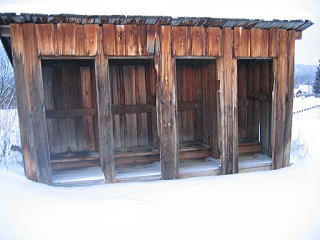 町の上下水道がここまで来ていないので、電話ボックスのようなトイレ小屋が少し離れたところにあり、ドアを閉めると中は真っ暗です。昼間ですと、トイレ小屋の板張りの隙間からの光で、ようやくどこに穴があるかわかります。暗がりに目が慣れるまで、においを我慢して立っています。氷でつるつるになっているトイレ小屋で、たとえ片足でも穴に落ちたらやばいです。夜ですと、板の隙間からの光もないので、ドアを少し開けておくことになります。誰かに見られる危険を冒すか、穴に落ちる危険を冒すかどちらかです。同伴者がいる時は、誰も近づかないよう番をしてもらえます。日本のハイテク(公衆)トイレに慣れている人にはそれなりのエキゾチックな体験ができます。 厨房ではどうやって料理したり食器を洗ったりしているのかわかりませんが、洗面所で客が手を洗う時は、吊るしタンク式容器の上からに柄杓で水を入れてもらい、下から出して洗います。 |